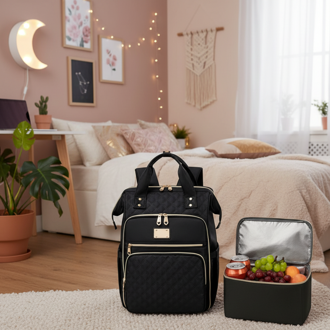 Conoce la Mochila de Almuerzo Acolchada de Vellora™., inspirada en nuestra exclusiva tote. Tu mochila todo en uno diseñada para el trabajo, el almuerzo y la vida diaria. Cuenta con una funda acolchada para laptop, un interior espacioso y una bolsa de almuerzo aislada y desmontable que mantiene la comida caliente o fría durante horas.